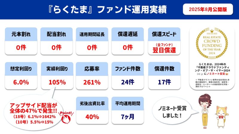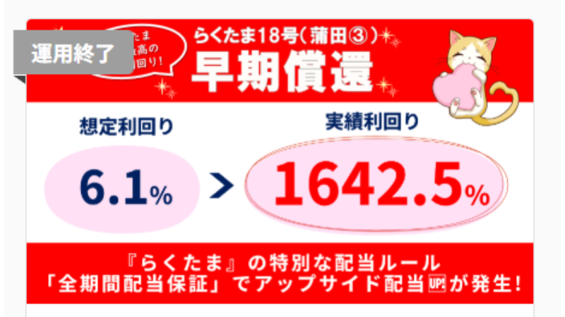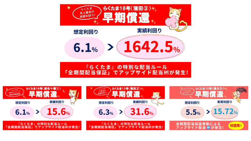 らくたまでは想定利回りを大幅に超える実績を多数出しており、組成ファンドの約半数で想定を超える配当を出しています。