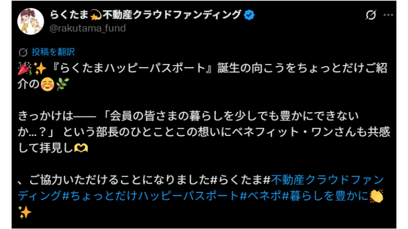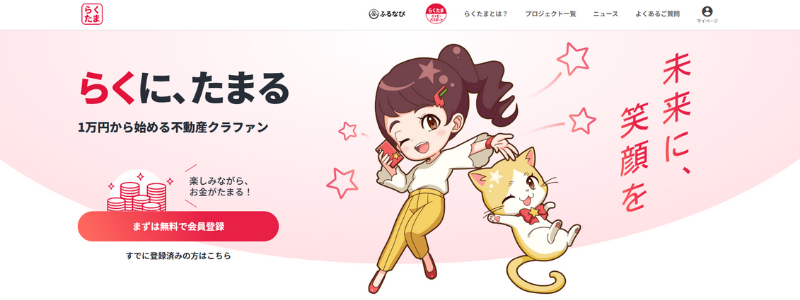 らくたまは投資家ファーストで投資家保護や優待など様々なサービスを提供していることが特徴の2024年3月に開始した不動産クラファンです。