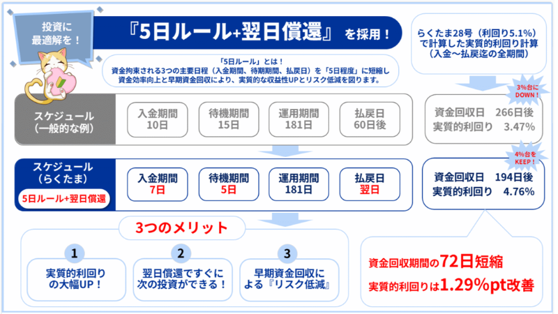 投資家の資金が遊んでいる期間を可能な限り抑えて、利回りを上げる仕組みとして5日ルールと翌日償還を行っています。