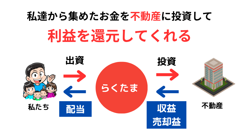 集まった資金で、不動産を購入・運用して得られた収益を投資家に分配する仕組みです。