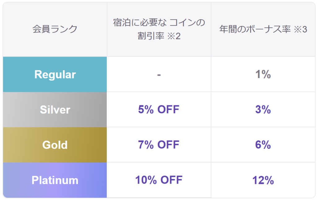 長く使い続けるほど、同じお金でより豪華な宿に泊まれる仕組みになってる。