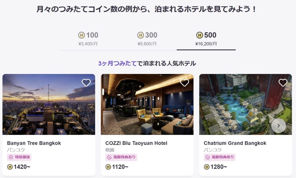 毎月コインを積み立てて、 そのコインで国内外のホテルに泊まれるサービス✈